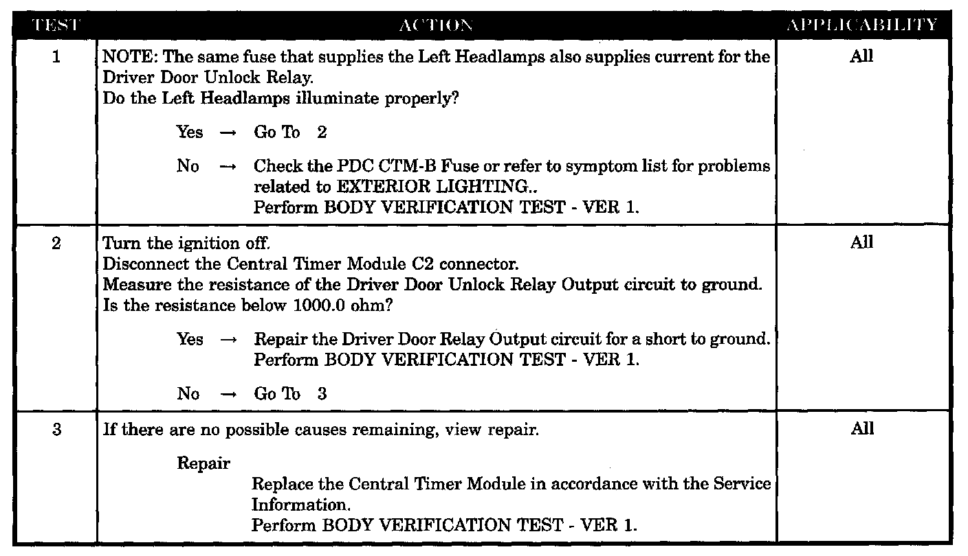DRIVER DOOR FAILS TO UNLOCK FROM ANY SWITCH