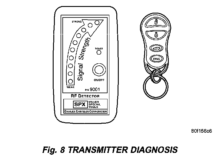 Using special tool 9001, first test to ensure that the transmitter is functioning. Typical testing distance is 2.5 centimeters (1 inch) for Asian transmitters and 30.5 centimeters (12 inches) for all others. To test, position the transmitter as shown. Press any transmitter button, then test each button individually. The tool will beep if a radio signal strength that lights five or more LED's is detected. Repeat this test three times. If transmitter fails any of the test refer to the Diagnostic Procedures manual.