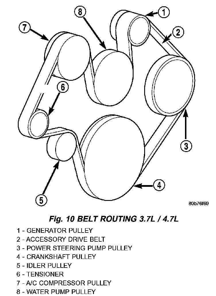 CAUTION: When installing the serpentine accessory drive belt, the belt MUST be routed correctly. If not, the engine may overheat due to the water pump rotating in the wrong direction (Fig. 10).