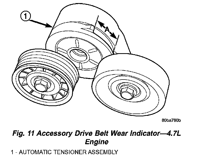 3. With the drive belt installed, inspect the belt wear indicator (Fig. 11). On 4.7L Engines only, the gap between the tang and the housing stop (measurement A) must not exceed 24 mm (0.94 inches). If the measurement exceeds this specification replace the serpentine accessory drive belt.