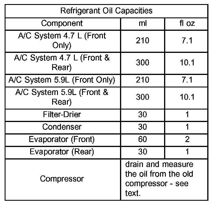 Refrigerant oil must be added when a filter-drier, evaporator coil, or condenser are replaced. See the Refrigerant Oil Capacities chart. When a compressor is replaced, the refrigerant oil must be drained from the old compressor and measured. Drain all of the refrigerant oil from the new compressor, then fill the new compressor with the same amount of refrigerant oil that was drained out of the old compressor.