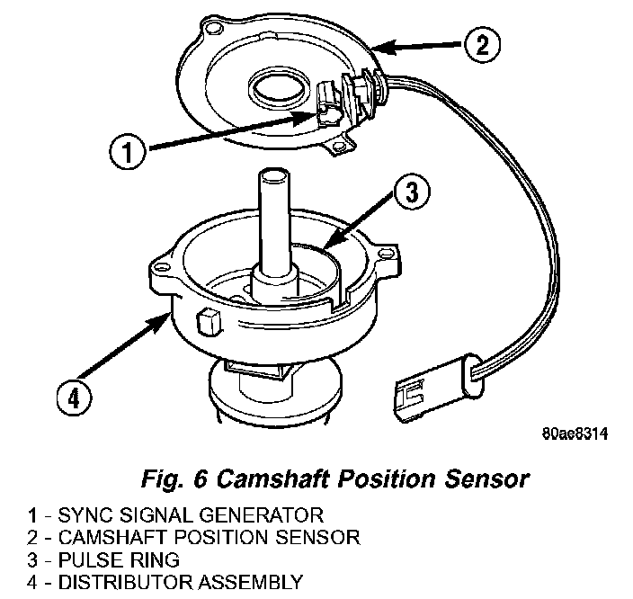 The camshaft position sensor is located in the distributor on all 3.9L V-6 and 5.2/5.9L V-8 engines.