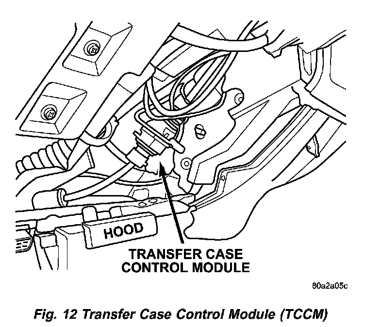 The Transfer Case Control Module (TCCM) (Fig. 12) is a microprocessor-based assembly controlling the 4X4 transfer case shift functions via the actuation of a shift motor and utilizing the feedback of a mode sensor assembly. Communication is via the PCI serial bus. Inputs include user selectable 4X4 modes that include AWD (NV244), 2WD (NV133 and NV233), 4HI, 4L0, and Neutral. The logic and driver circuitry is contained in a molded plastic housing with an embedded heat-sink and is located behind the center section of the lower instrument panel, to the right of the steering column.