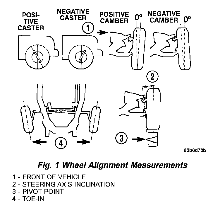 DESCRIPTIONWheel alignment involves the correct positioning of the wheels in relation to the vehicle. The positioning is accomplished through suspension and steering linkage adjustments. An alignment is considered essential for efficient steering, good directional stability and to minimize tire wear. The most important measurements of an alignment are caster, camber and toe.