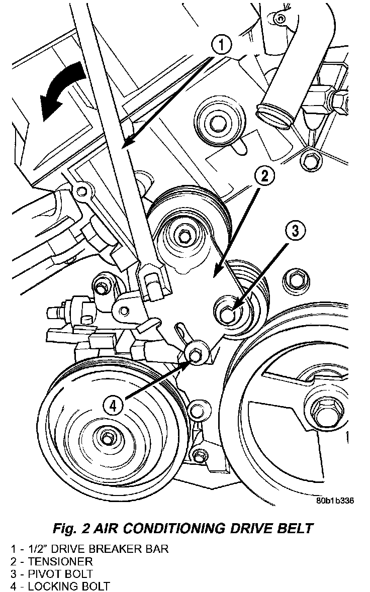 3. Insert 1/2" drive breaker bar into square opening on belt tensioner. Rotate tensioner counterclockwise until belt can be removed from pulleys (Fig. 2).