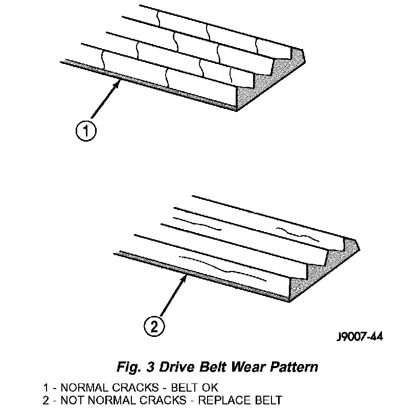 Poly-V Belt system may develop minor cracks across the ribbed side (due to reverse bending). These minor cracks are considered normal and acceptable. Parallel cracks are not (Fig. 3).