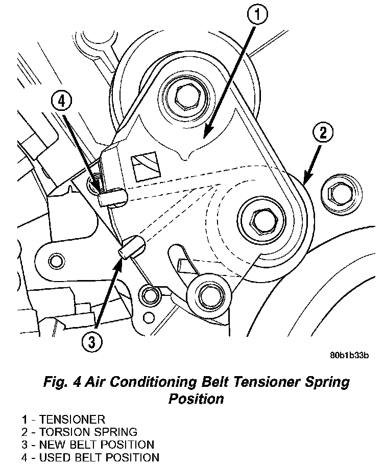 NOTE: Verify that torsion spring position is in the new belt position before installing a NEW belt (Fig. 4). If torsion spring is not in the new belt position, follow steps 1-7 to change the tensioner spring from the USED belt position to the NEW belt position.