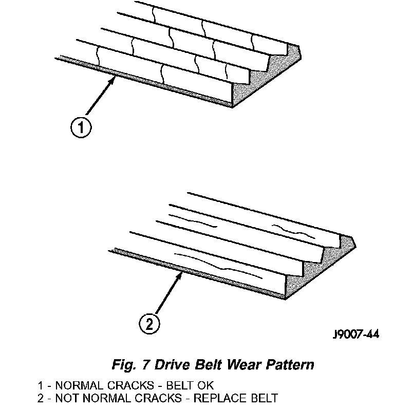 Poly-V Belt system may develop minor cracks across the ribbed side (due to reverse bending). These minor cracks are considered normal and acceptable. Parallel cracks are not (Fig. 7).