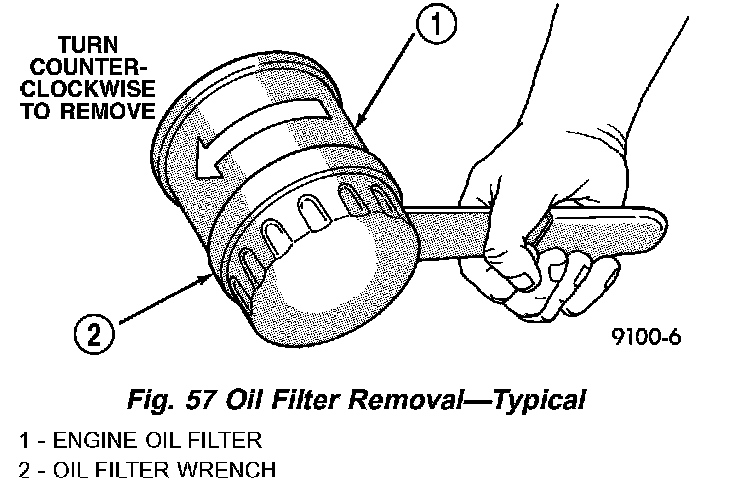 3. Rotate the oil filter counterclockwise to remove it from the cylinder block oil filter boss (Fig. 57).