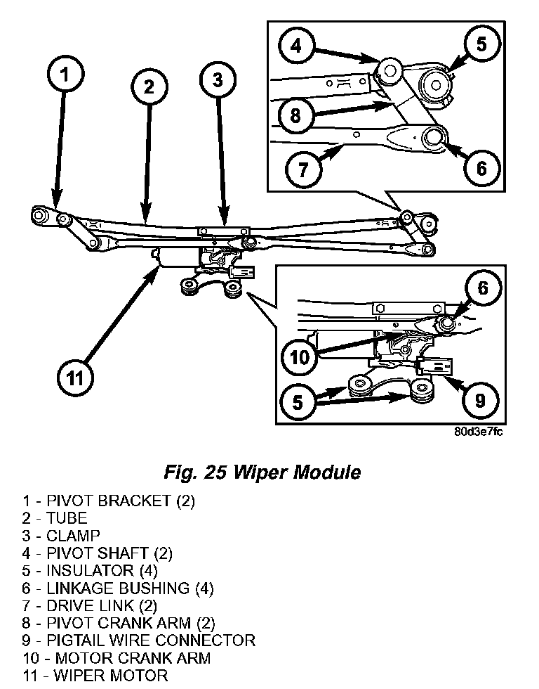 The wiper motor bracket is secured with two screws below the wiper motor through two rubber insulators to the bottom of the cowl plenum panel beneath the cowl plenum cover/grille panel. Two screws secure the top of the wiper module bracket to the cowl plenum panel through rubber insulators located on the outboard end of each pivot bracket. The ends of the wiper pivot shafts that protrude through dedicated openings in the cowl plenum cover/grille panel to drive the wiper arms and blades are the only visible components of the wiper module. The wiper module consists of the following major components: