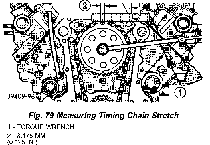 3. Hold a scale with dimensional reading even with the edge of a chain link. With cylinder heads installed, apply 14 Nm (30 ft. lbs.) torque in the reverse direction. With the cylinder heads removed, apply 20 Nm (15 ft. lbs.) torque in the reverse direction. Note the amount of chain movement (Fig. 79).