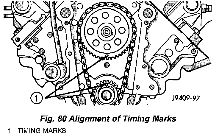 5. Slide both sprockets evenly over their respective shafts and use a straightedge to check alignment of timing marks (Fig. 80).