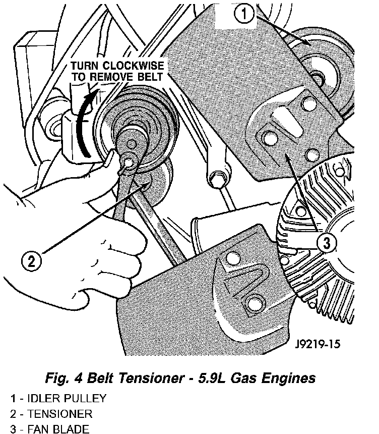 Drive belts on these engines are equipped with a spring loaded automatic belt tensioner (Fig. 4). This belt tensioner will be used on all belt configurations, such as with or without power steering or air conditioning.
