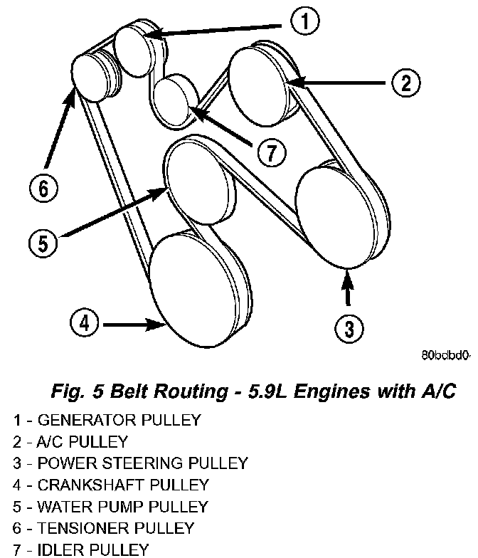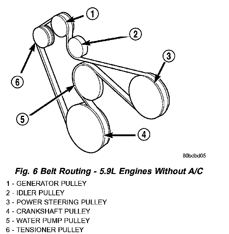 CAUTION: When installing the accessory drive belt, the belt must be routed correctly. If not, engine may overheat due to water pump rotating in wrong direction. Refer to (Fig. 5) (Fig. 6) for correct engine belt routing. The correct belt with correct length must be used.