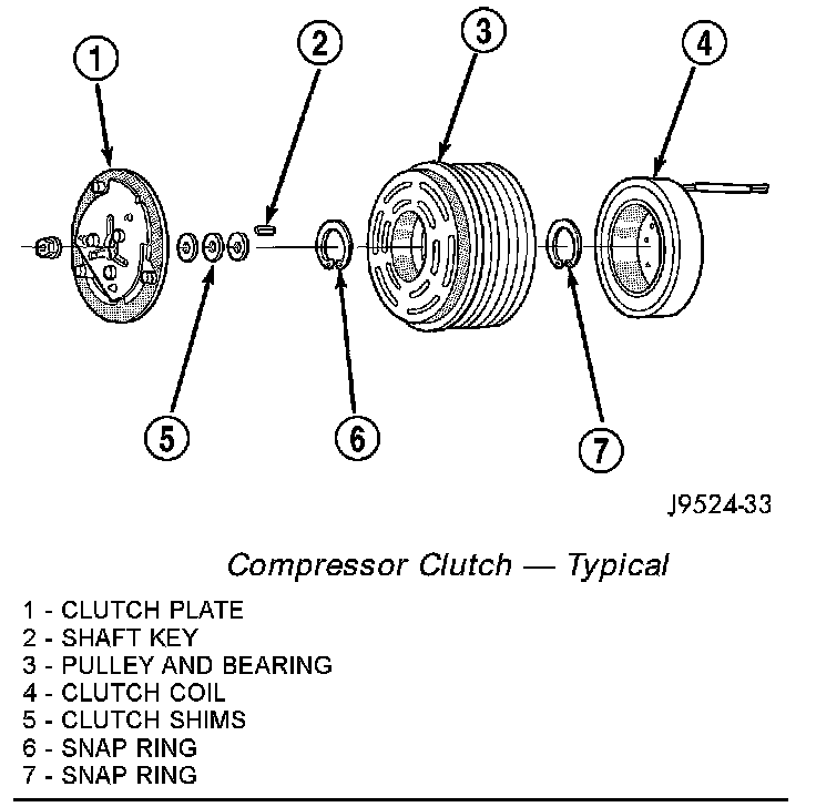 The compressor clutch assembly consists of a stationary electromagnetic coil, a hub bearing and pulley assembly, and a clutch plate. The electromagnetic coil unit and the hub bearing and pulley assembly are each retained on the nose of the compressor front housing with snap rings. The clutch plate is keyed to the compressor shaft and secured with a bolt.