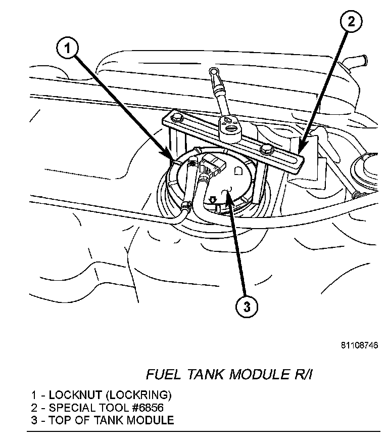 4. The plastic fuel tank module locknut (lockring) is threaded onto fuel tank. Install Special Tool #6856 to locknut and remove locknut. The fuel tank module will spring up slightly after locknut is removed.