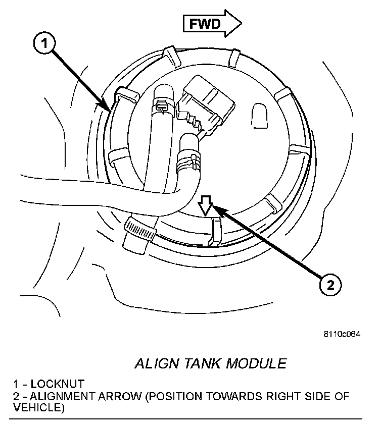 4. Both fuel line fittings should be pointed to the right side of the vehicle. Rotate and position alignment arrow towards right side of vehicle (if necessary) before tightening locknut. This step must be performed to prevent the module's float from contacting the side of fuel tank.