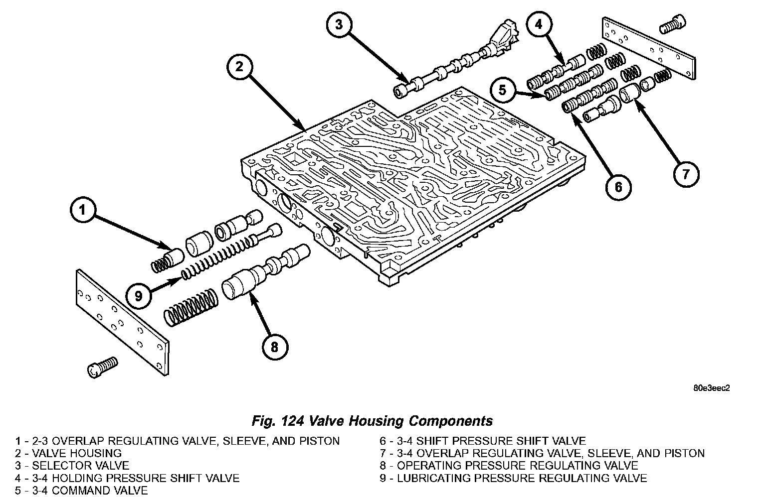 3. Install all valves and springs into the valve housing (2) (Fig. 124). Check all valves for ease of movement and shavings.