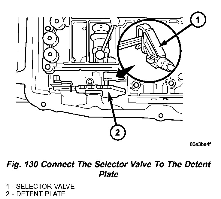 2. Insert selector valve (1) (Fig. 130) in driver of detent plate (2). When installing the electrohydraulic control module in the transmission housing, the plastic part of the selector valve (1) must engage in the driver of the detent plate (2).