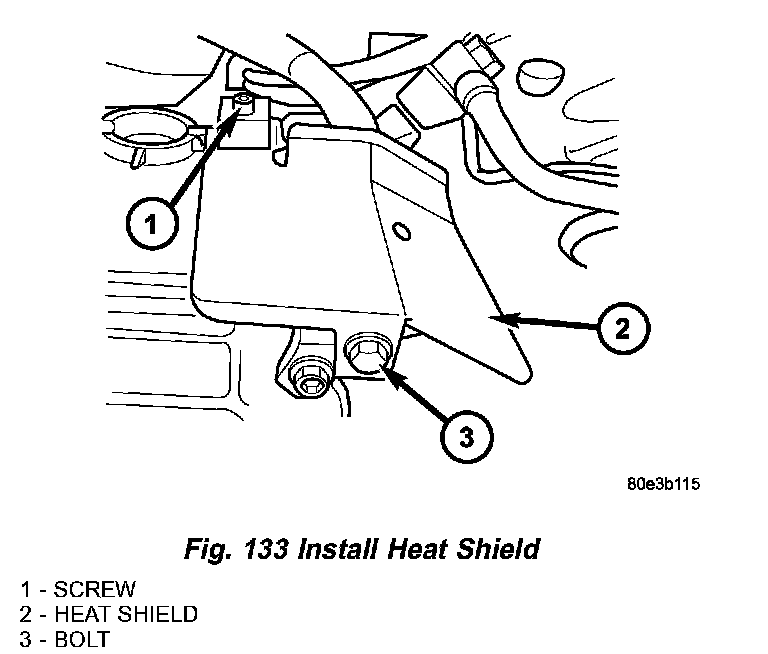 10. Position the heat shield (2) (Fig. 133) onto the transmission housing and install the screw (1) and bolt (3) to hold the shield in place.
