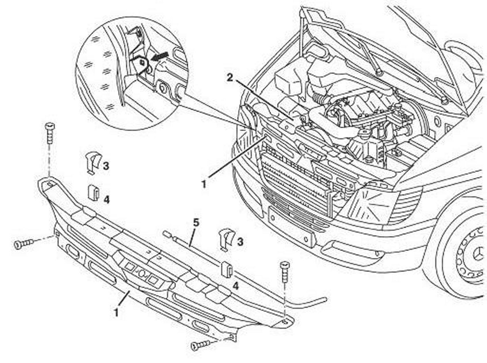 6. Remove lock cross member (1) and unhook hood release cable (5).