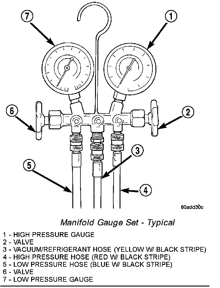 A manifold gauge set may be needed with some recovery/recycling/charging equipment. The service hoses on the gauge set being used should have manual (turn wheel), or automatic back-flow valves at the service port connector ends. This will prevent refrigerant from being released into the atmosphere.