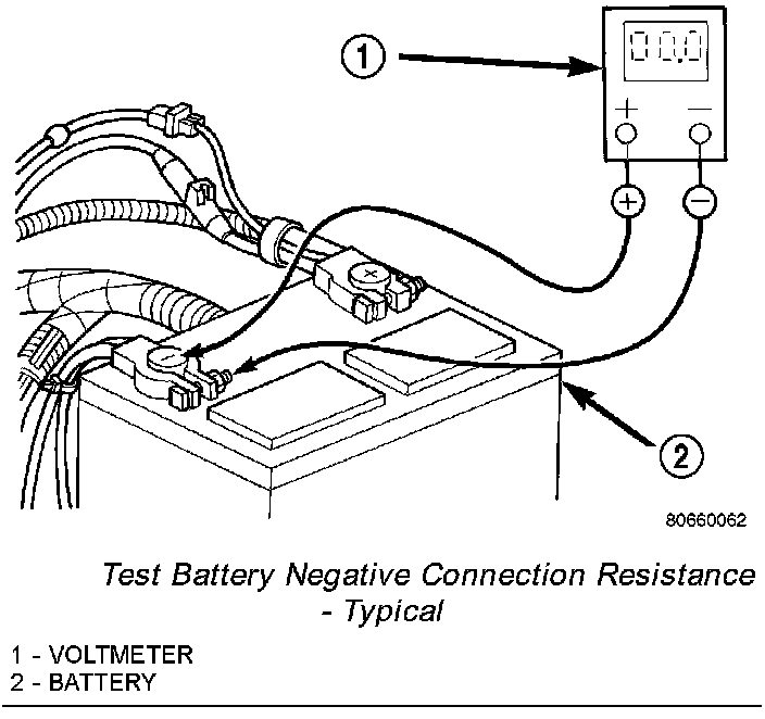 1. Connect the positive lead of the voltmeter to the battery negative terminal post. Connect the negative lead of the voltmeter to the battery negative cable terminal clamp. Rotate and hold the ignition switch in the Start position. Observe the voltmeter. If voltage is detected, correct the poor connection between the battery negative cable terminal clamp and the battery negative terminal post.
