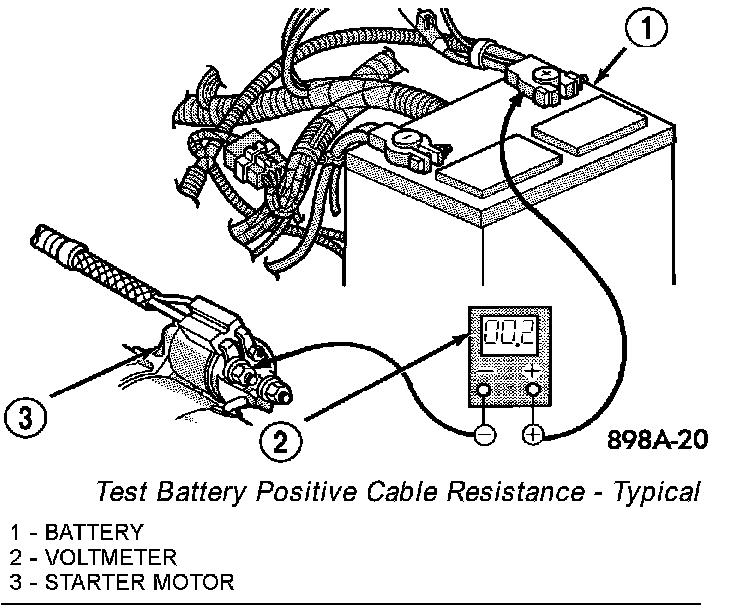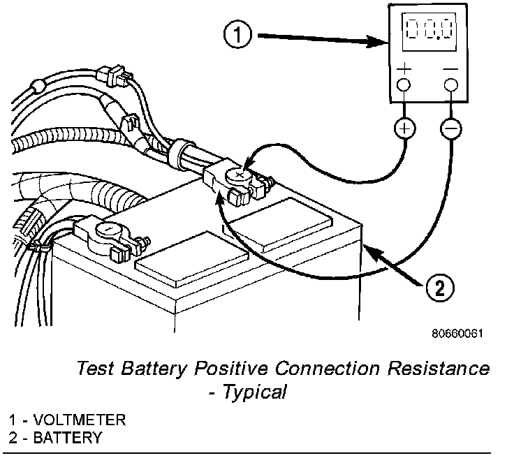 When performing the voltage drop test, it is important to remember that the voltage drop is giving an indication of the resistance between the two points at which the voltmeter probes are attached. EXAMPLE: When testing the resistance of the battery positive cable, touch the voltmeter leads to the battery positive cable terminal clamp and to the battery positive cable eyelet terminal at the starter solenoid B(+) terminal stud. If you probe the battery positive terminal post and the battery positive cable eyelet terminal at the starter solenoid B(+) terminal stud, you are reading the combined voltage drop in the battery positive cable terminal clamp-to-terminal post connection and the battery positive cable.