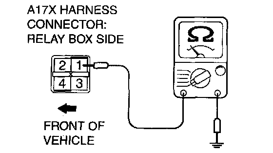 3) Measure the resistance between terminals 1 and 4 of the A/T control relay.
