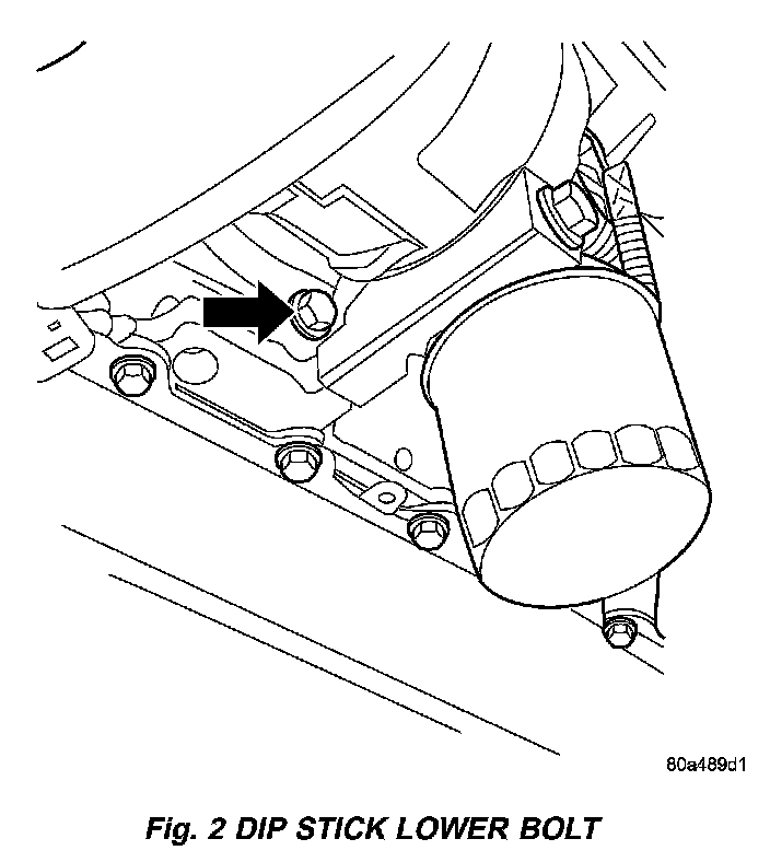 10. Install the lower oil dip stick tube bolt and tighten (Fig. 2).