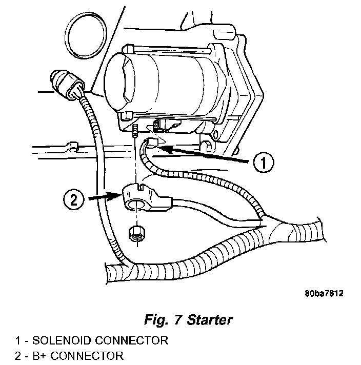 4. Remove nut holding B+ terminal to starter solenoid (Fig. 7).