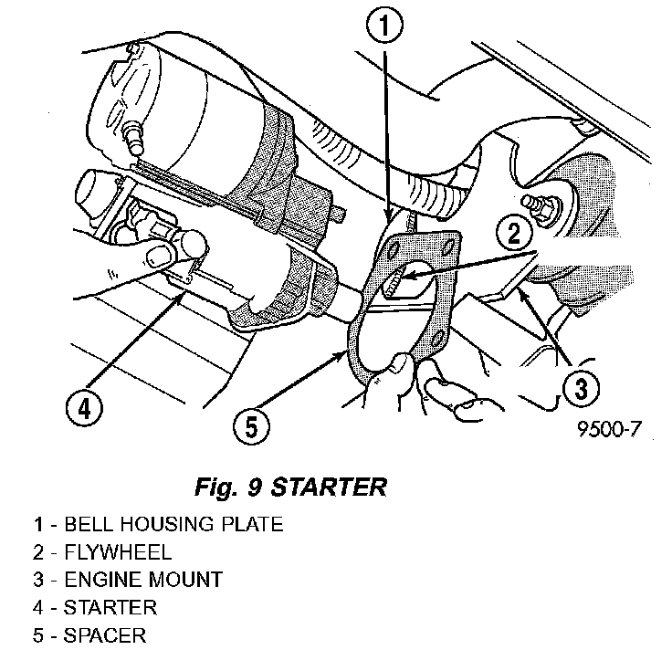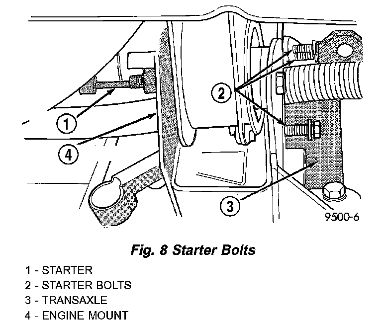 6. Remove bolts holding starter to transaxle bell-housing (Fig. 8).