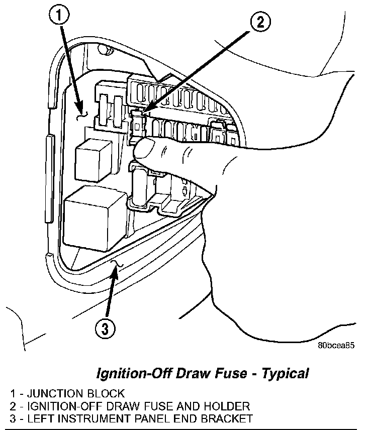 The Ignition-Off Draw (IOD) fuse is disconnected from Junction Block (JB) fuse cavity 12 (Fig. 5) when the vehicle is shipped from the assembly plant. Dealer personnel must reconnect the IOD fuse when the vehicle is being prepared for delivery in order to restore full electrical system operation.