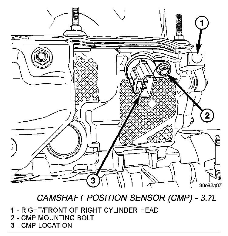 The Camshaft Position Sensor (CMP) on the 3.7L V-6 engine is bolted to the front/top of the right cylinder head.