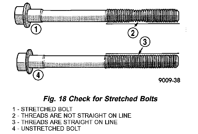 Necking can be checked by holding a straight edge against the threads. If all the threads do not contact the scale. the bolt should be replaced (Fig. 18).