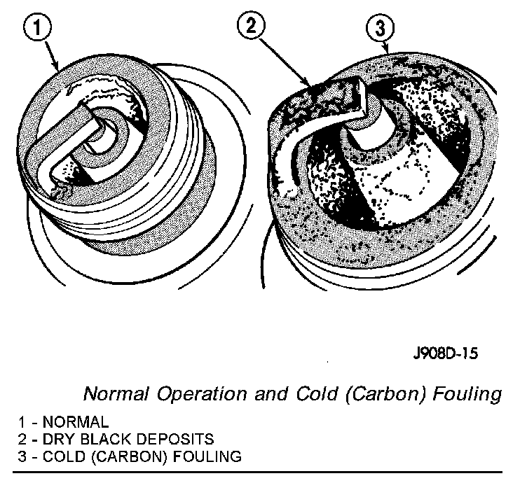 Cold fouling is sometimes referred to as carbon fouling. The deposits that cause cold fouling are basically carbon. A dry, black deposit on one or two plugs in a set may be caused by sticking valves or defective spark plug cables. Cold (carbon) fouling of the entire set of spark plugs may be caused by a clogged air cleaner element or repeated short operating times (short trips).