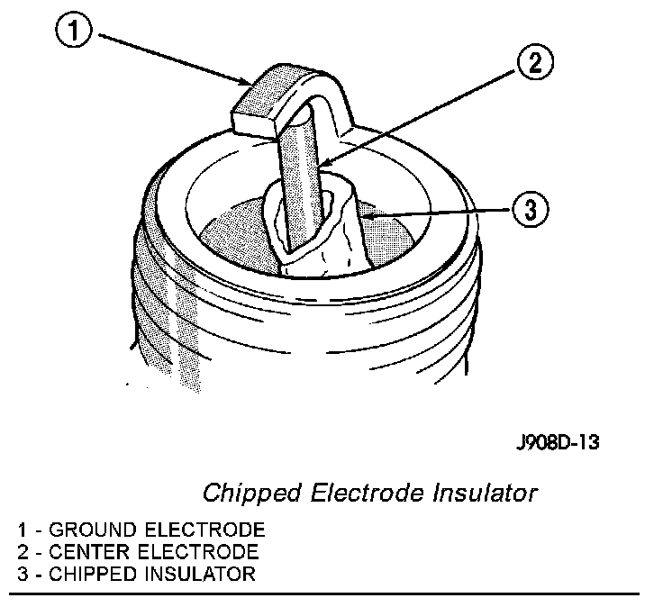 A chipped electrode insulator usually results from bending the center electrode while adjusting the spark plug electrode gap. Under certain conditions, severe detonation can also separate the insulator from the center electrode. Spark plugs with this condition must be replaced.