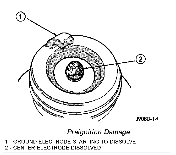 Preignition damage is usually caused by excessive combustion chamber temperature. The center electrode dissolves first and the ground electrode dissolves somewhat latter. Insulators appear relatively deposit free. Determine if the spark plug has the correct heat range rating for the engine. Determine if ignition timing is over advanced or if other operating conditions are causing engine overheating. (The heat range rating refers to the operating temperature of a particular type spark plug. Spark plugs are designed to operate within specific temperature ranges. This depends upon the thickness and length of the center electrodes porcelain insulator.