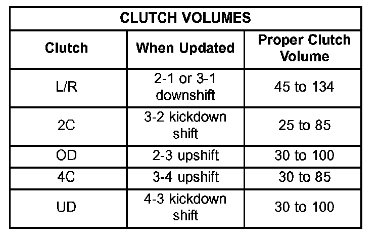 Certain mechanical problems within the input clutch assembly can cause inadequate or out-of-range element volumes. Also, defective Input/Output Speed Sensors and wiring can cause these conditions. The Clutch Volume chart identifies the appropriate clutch volumes and when they are monitored/updated.