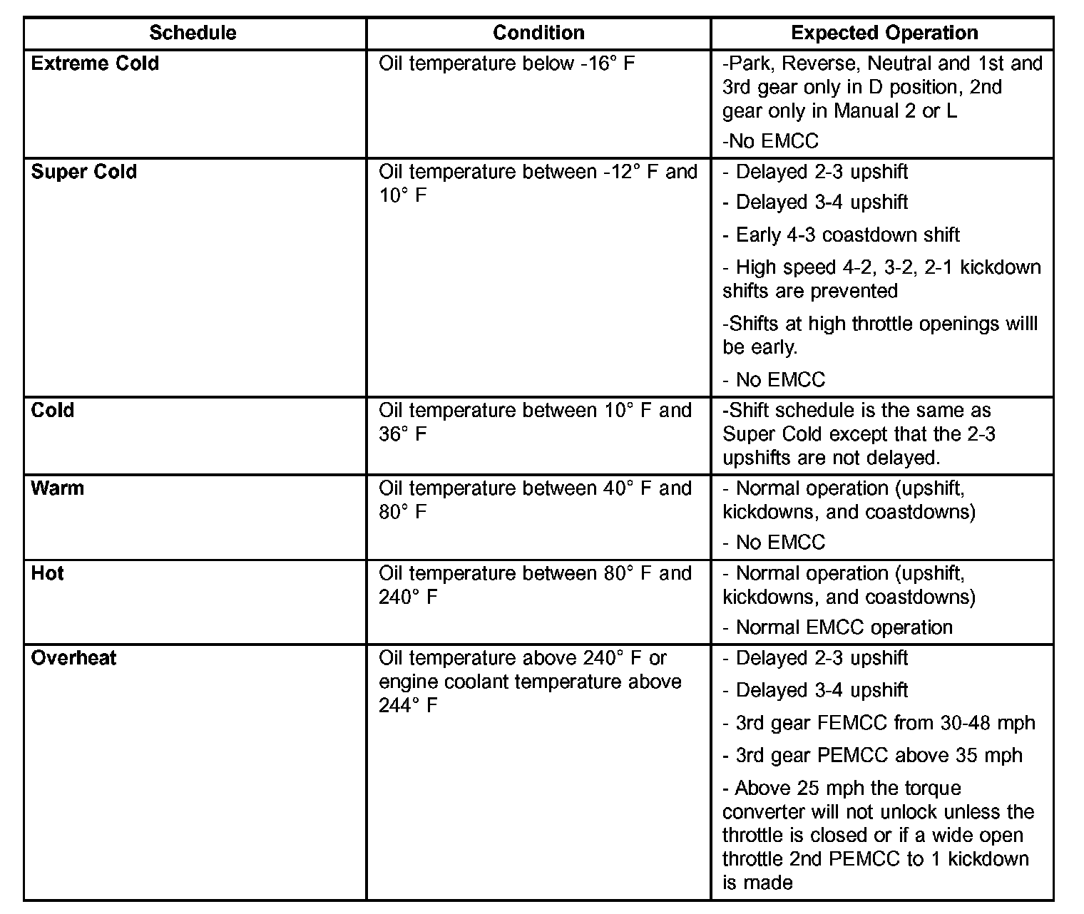 As driving conditions change, the TCM appropriately adjusts the shift schedule. Refer to the following chart to determine the appropriate operation expected, depending on driving conditions.