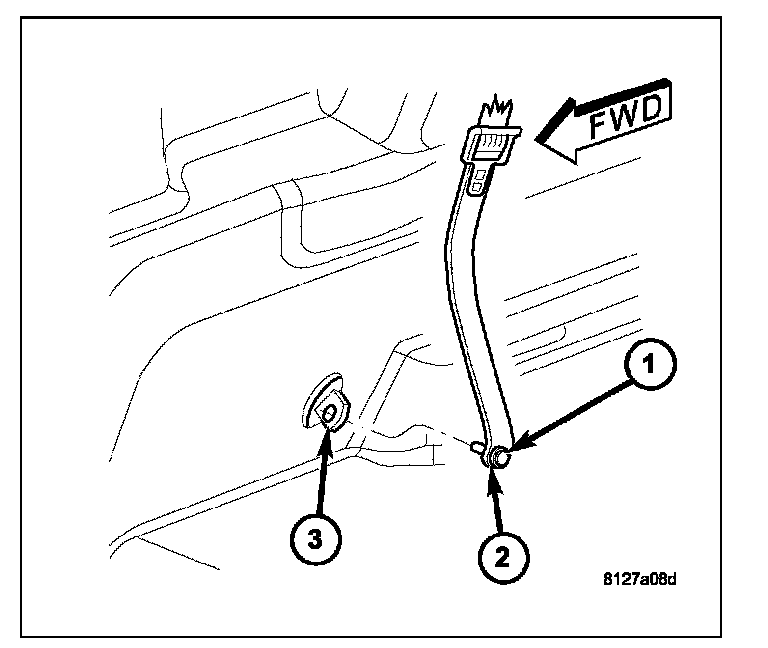 WARNING: TO AVOID PERSONAL INJURY OR DEATH, DURING AND FOLLOWING ANY SEAT BELT OR CHILD RESTRAINT ANCHOR SERVICE, CAREFULLY INSPECT ALL SEAT BELTS, BUCKLES, MOUNTING HARDWARE, RETRACTORS, TETHER STRAPS, AND ANCHORS FOR PROPER INSTALLATION, OPERATION, OR DAMAGE. REPLACE ANY BELT THAT IS CUT, FRAYED, OR TORN. STRAIGHTEN ANY BELT THAT IS TWISTED. TIGHTEN ANY LOOSE FASTENERS. REPLACE ANY BELT THAT HAS A DAMAGED OR INOPERATIVE BUCKLE OR RETRACTOR. REPLACE ANY BELT THAT HAS A BENT OR DAMAGED LATCH PLATE OR ANCHOR PLATE. REPLACE ANY CHILD RESTRAINT ANCHOR OR THE UNIT TO WHICH THE ANCHOR IS INTEGRAL THAT HAS BEEN BENT OR DAMAGED. NEVER ATTEMPT TO REPAIR A SEAT BELT OR CHILD RESTRAINT COMPONENT. ALWAYS REPLACE DAMAGED OR FAULTY SEAT BELT AND CHILD RESTRAINT COMPONENTS WITH THE CORRECT, NEW AND UNUSED REPLACEMENT PARTS LISTED IN THE DAIMLERCHRYSLER MOPAR PARTS CATALOG.REMOVAL
