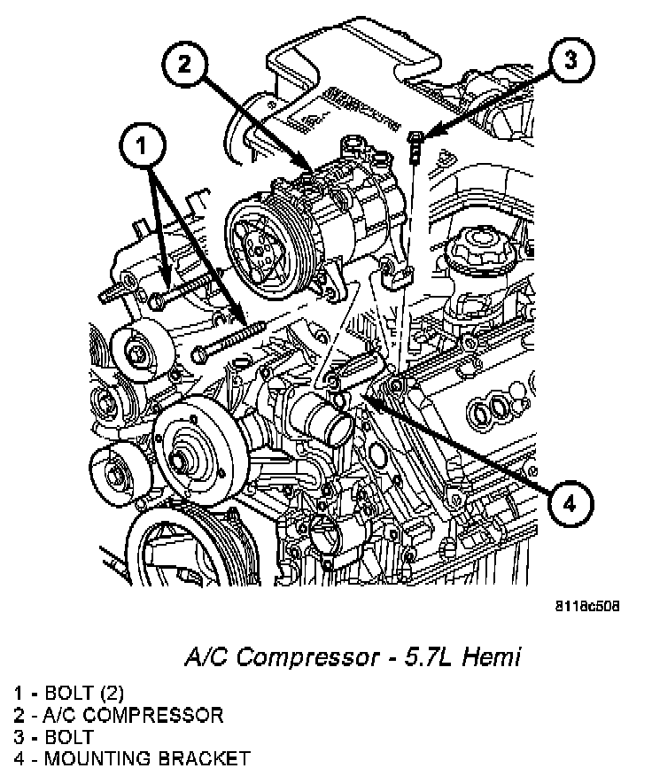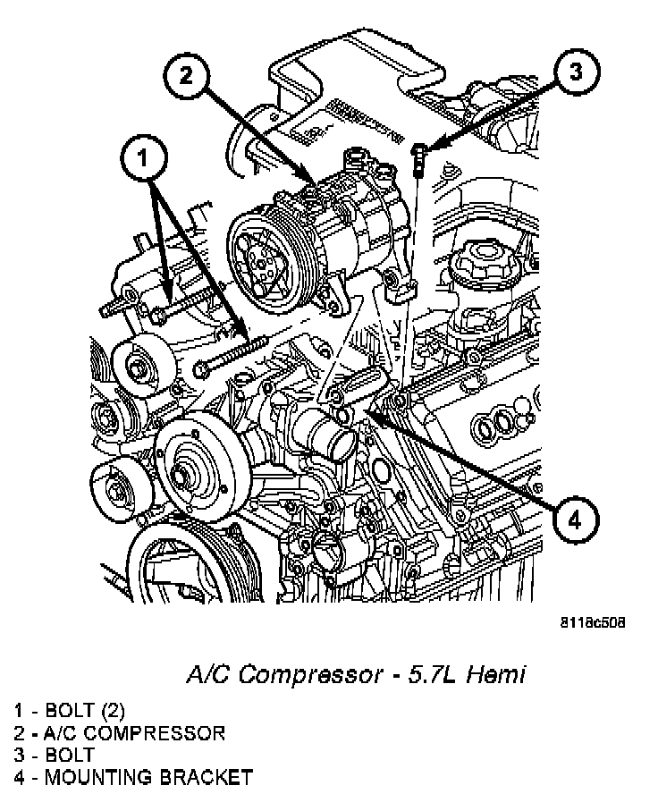 9. If equipped with the 5.7L Hemi engine, remove the nuts and bolts that secure the generator and A/C compressor support bracket and remove the bracket from the engine.