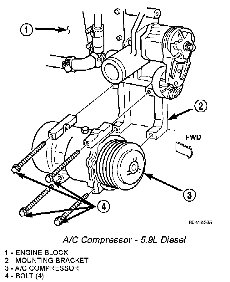 NOTE: The A/C compressor may be removed and repositioned without disconnecting the refrigerant lines or discharging the refrigerant system. Discharging is not necessary if servicing the compressor clutch, clutch coil, engine, engine cylinder head or the generator.