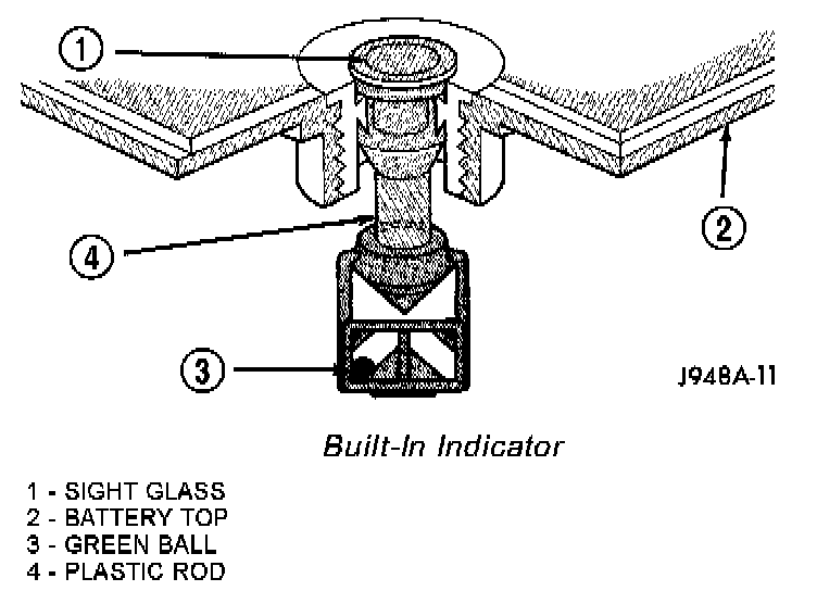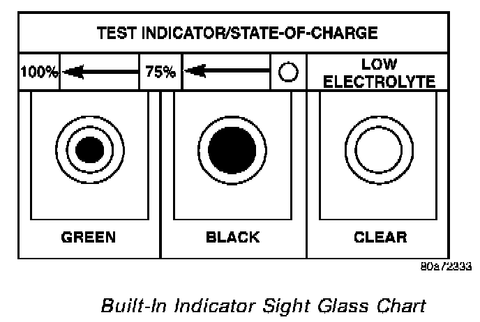BUILT-IN INDICATOR TESTIf equipped, an indicator (hydrometer) built into the top of the battery case provides visual information for battery testing. Like a hydrometer, the built-in indicator measures the specific gravity of the battery electrolyte. The specific gravity of the electrolyte reveals the battery state-of-charge; however, it will not reveal the cranking capacity of the battery. A load test must be performed to determine the battery cranking capacity. Refer to Standard Procedures for the proper battery load test procedures.