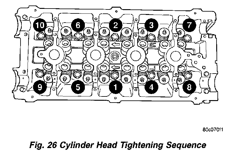 Tighten the cylinder head bolts in the sequence shown in (Fig. 26). Using the 4 step torque-turn method, tighten according to the following values: