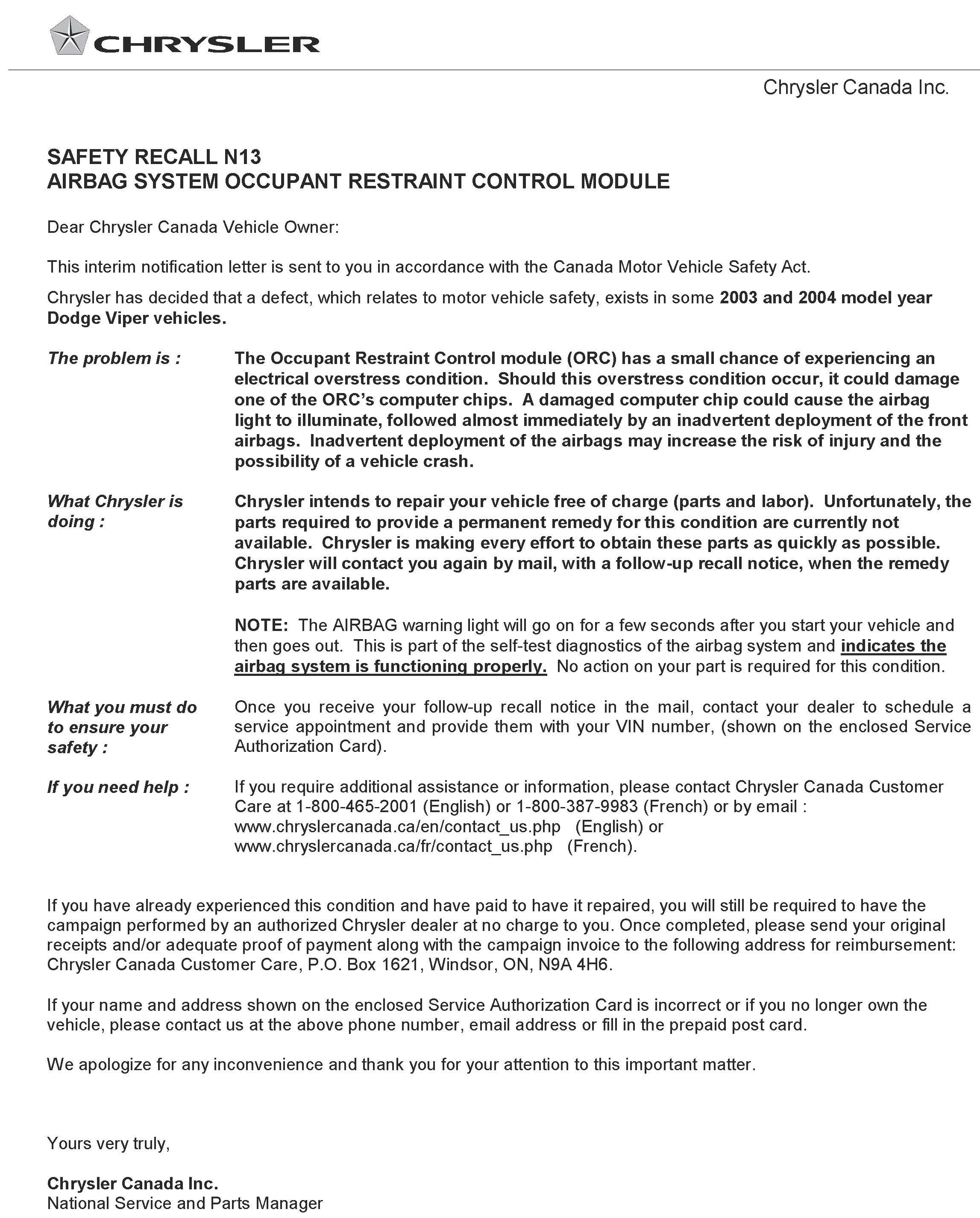 Canada - Recall - Occupant Restraint Control Module Overstress