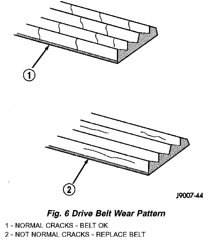Poly-V Belt system may develop minor cracks across the ribbed side (due to reverse bending). These minor cracks are considered normal and acceptable. Parallel cracks are not (Fig. 6).