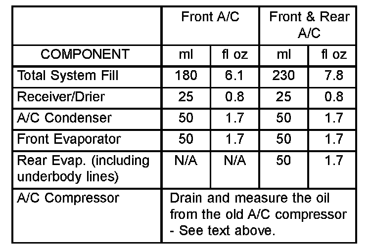 Refrigerant oil must be added when a receiver/ drier, A/C evaporator or A/C condenser is replaced. See the Refrigerant Oil Capacities chart. When an A/C compressor is replaced, the refrigerant oil must be drained from the old compressor and measured. Drain all of the refrigerant oil from the new A/C compressor, then fill the new compressor with the same amount of refrigerant oil that was drained out of the old compressor.