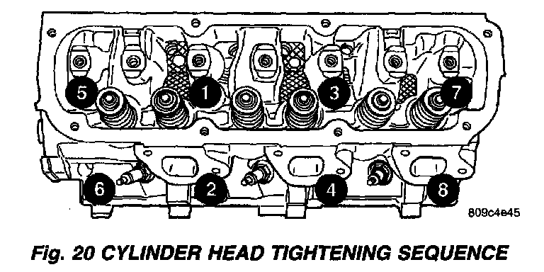 CYLINDER HEAD BOLT TORQUE/SEQUENCETighten the cylinder head bolts 1-8 in the sequence shown in (Fig. 20). Using the 4 step torque turn method, tighten according to the following values: