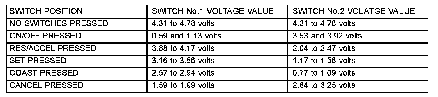 Cruise Switch inputs are not coherent with each other. Example: PCM is reading Switch No.1 as Accel and Switch No.2 as Coast at the same time. One trip fault.